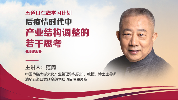 2020年5月6日晚,清华五道口云课堂“师友沙龙”特邀中国传媒大学文化产业管理学院院长、教授、博导范周做了主题为“后疫情时代下产业结构调整的若干思考”的线上分享。范周同时也是清华五道口文创金融领袖项目的授课师资。