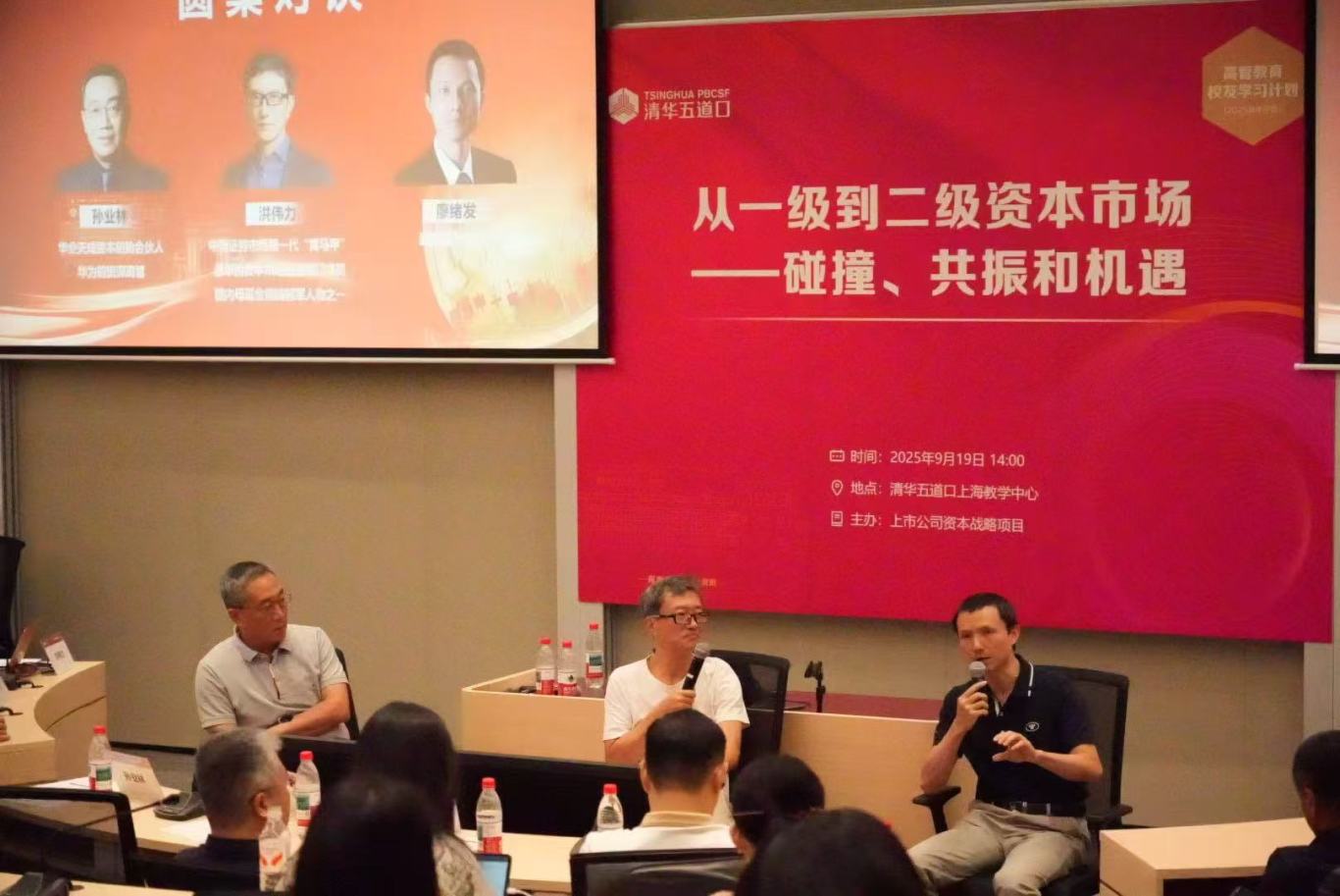 2025年9月19日,由清华大学五道口金融学院高管教育中心「上市公司资本战略」项目主办的校友讲座在上海圆满落幕。本讲座以《从一级到二级资本市场:碰撞、共振与机遇》为主题,特邀项目常驻师资洪伟力博士出席现场,与华业天成资本创始人孙业林、盛镛资本董事长廖绪同台,围绕当前一二级资本市场的热点问题展开深度对话。近百名清华五道口校友赴上海学习中心参与活动,标志着项目校友活动系列「资本战略千人汇」的又一次成功落地。
