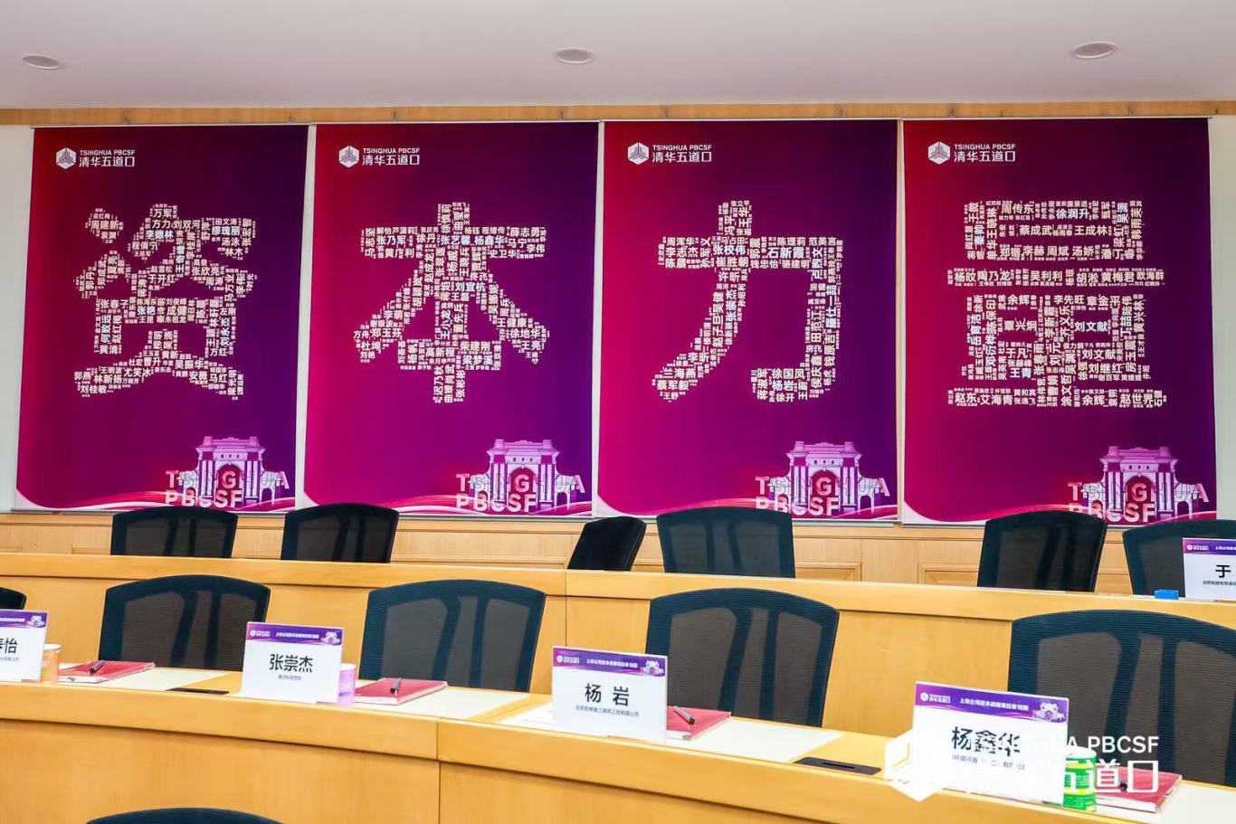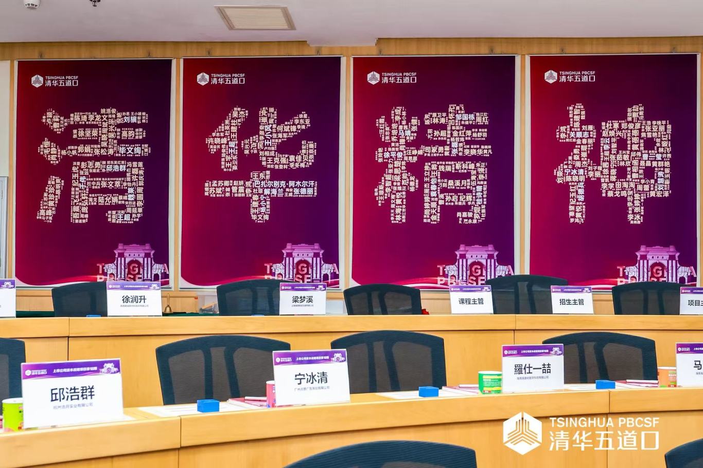 在开班仪式的高光环节,教室四面悬挂的"清华精神,资本力量"八个鎏金大字成为全场焦点。八个大字的笔画间镶嵌着千余位校友的姓名,构成一幅跨越时空的人才图谱。18期班新生的名字以最大字号醒目呈现,象征着新生代的力量与前辈校友的精神传承。随后进行的校徽佩戴仪式将活动推向高潮。学员们郑重地将清华校徽佩戴于胸前,继而齐声高唱校歌。庄严的旋律中,"自强不息,厚德载物"的校训通过音符直抵心灵,完成了一场深刻的文化认同仪式。仪式结束后,师生们奔赴秋色正浓的清华校园,到校史馆领略百年清华的深厚底蕴。