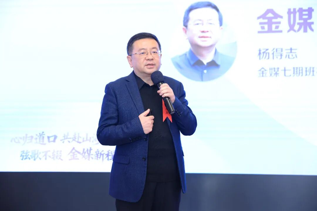 杨得志作为校友代表发言。他以“从新闻传播力到新质生产力——五道口金媒班带来的思考、启迪和实践”为题,用图片展示了在五道口学习和参访等一系列丰富多彩的活动,从中获得的“知识、能力和情谊”,并以自己学习期间在贵州省参与脱贫攻坚、乡村振兴、数字经济、文旅发展、疫情防控等实际工作的亲历和思考,展示了“把论文写在祖国大地上”的金融报国实践,从而得出“金融是思维方式、金融是价值判断、金融是强执行力”的深刻感悟。他表示,作为金媒大家庭的一员,今后将继续为金媒校友和同学们做好联络服务,与学院发展共同向前。