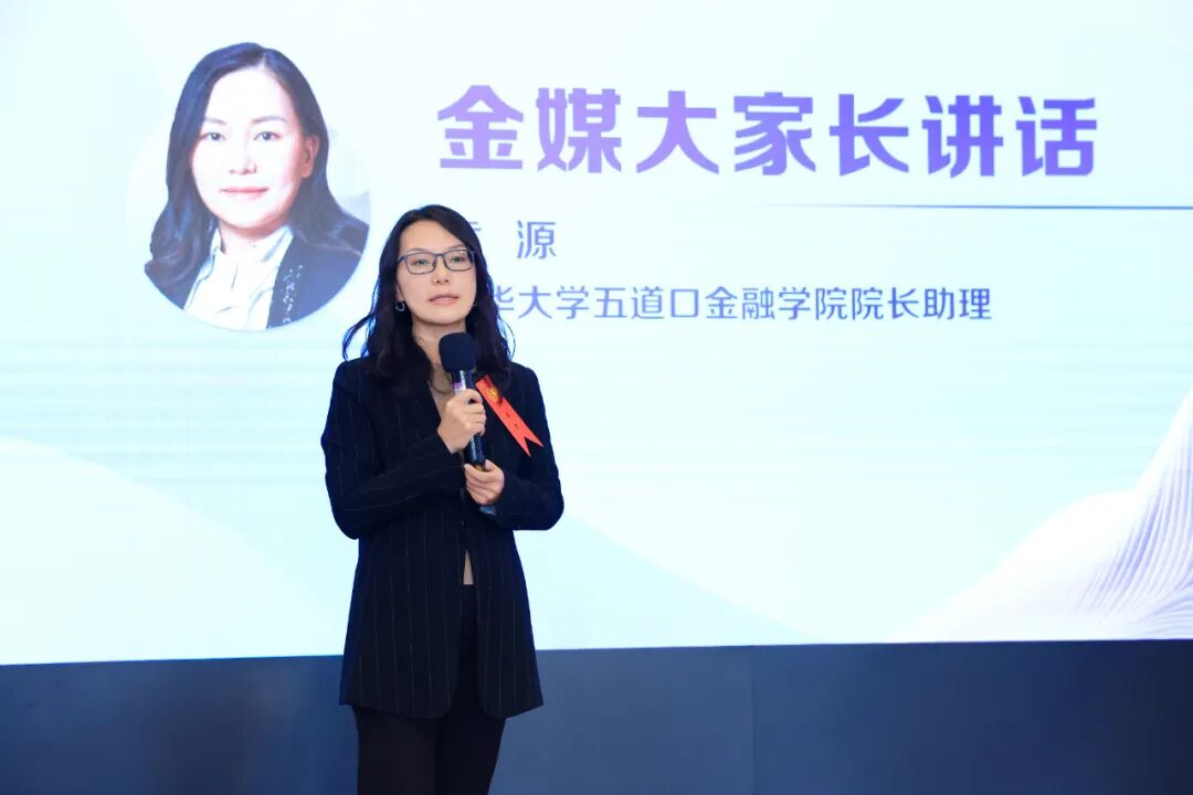 袁源代表金媒大家长讲话。她首先代表学院向参加活动的校友和同学表示热烈欢迎,随后介绍了目前学院的发展与现状。她提到在师资队伍方面,已经形成了专兼融汇、理论与实践并重、独具优势的高水平教师队伍;在人才培养体系方面,逐步构建了包括硕博、技术转移硕士、金融MBA、金融EMBA、高管教育等在内的人才培养体系;在学科建设方面,学院依托清华大学国家金融研究院和清华大学金融科技研究院承担众多科研项目,生产了大量的高水平研究成果,获得良好的学术声誉。她对金媒同学在学院发展中的各个方面所做出的贡献表示衷心地感谢,期盼未来能够继续建言献策,广泛参与到学院的建设与发展中。