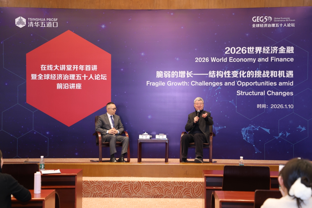 2026年1月10日,清华大学主楼接待厅座无虚席,清华五道口在线大讲堂联合全球经济治理五十人论坛推出的新年首讲在此举行,特邀国际货币基金组织(IMF)原副总裁、中国人民银行原副行长朱民担任主讲嘉宾。本次讲座主题为“世界经济金融2026:脆弱的增长——结构性变化的挑战和机遇”,由清华大学五道口金融学院院长焦捷教授主持,数百名清华五道口师生、校友及业界人士现场聆听,同时通过线上平台吸引了广泛关注。朱民以其深厚的学术功底和丰富的国际金融实践经验,系统梳理了当前全球经济金融面临的六个维度结构性变化,勾勒出一幅机遇与风险交织的2026年世界经济图景,为各界人士洞察趋势、应对变局提供了重要的思考框架。
