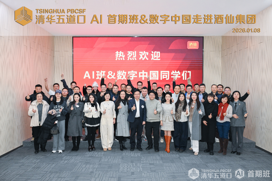 在正式课程开始前,AI首期班和数字中国企业家们还走进产业一线,深度感知AI变革实践。在酒仙集团,创始人兼董事长郝鸿峰作为清华五道口AI首期班班长,分享了传统酒类企业如何通过电商获得了跨越式发展,并与校友企业家们深入探讨了用AI营销和数字化变革开启下一轮增长的战略路径。